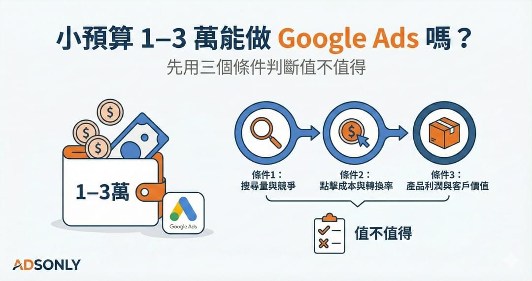 - January 21, 2026你缺的不是點擊,是「可成交的意圖+承接」 「有點擊但沒詢問」通常不是 Google 壞掉,也不是你的產品沒人要。我們看過太多企業每個月燒掉 5 萬、10 萬在無效點擊上,這不是因為廣告沒效,...January 13, 2026先逆著講:預設「不建議投」,除非你過了三個條件 小預算 1–3 萬(每月)能不能做 Google Ads?答案是:有些產業很可以,有些產業做了只是捐錢。 最容易失控的情況是這種...